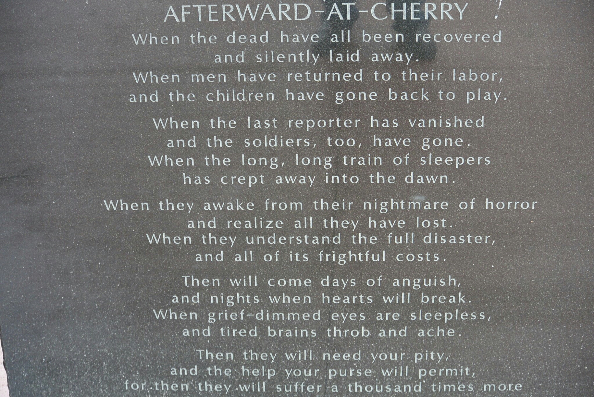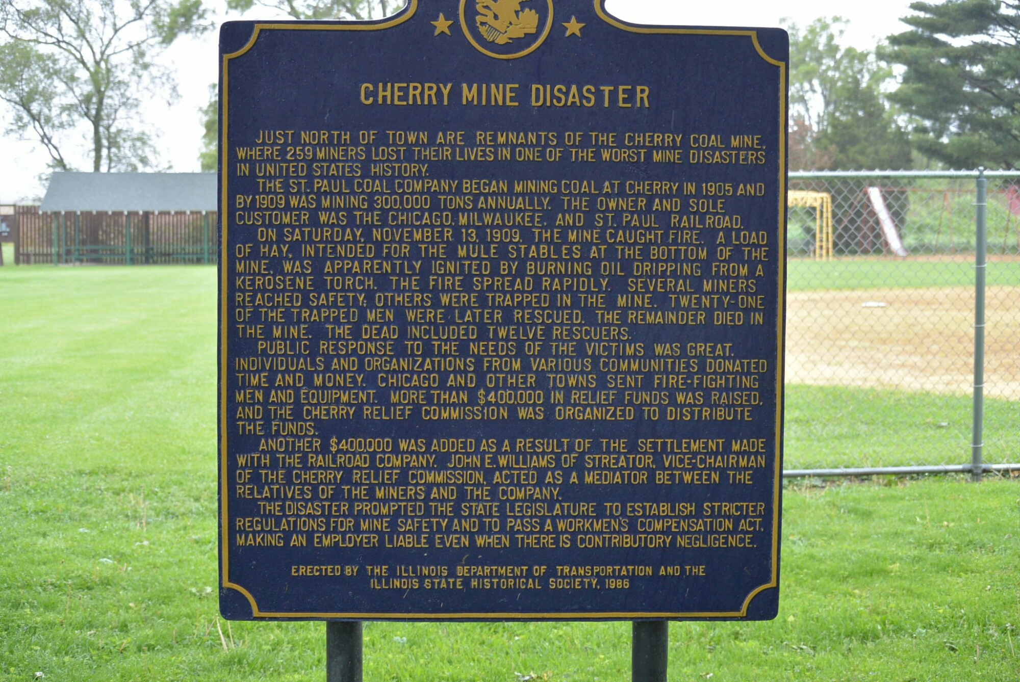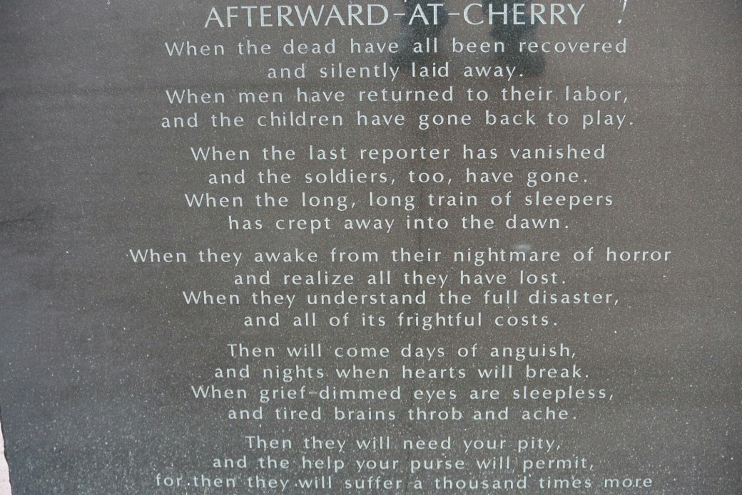 Cherry, Illinois is a small town in central Illinois Bureau County. It current population is approximately 500. In the early 1900’s, it was a coal mining town. The mine was started by the Saint Paul Coal Company in 1905. It was operational until 1927. It provided coal to the Milwaukee Railroad. In its prime, it produced 1,500 tons a day. The mine consisted of three horizontal shafts of varying depth and two vertical connecting shafts. The mine was considered to be safe at the time. It had a ventilation fan. It was thought to be fire proof. It was illuminated with electric lights. The miners were predominantly Italian immigrants. Many spoke no English. Many children some as young as 11 worked in the mine.