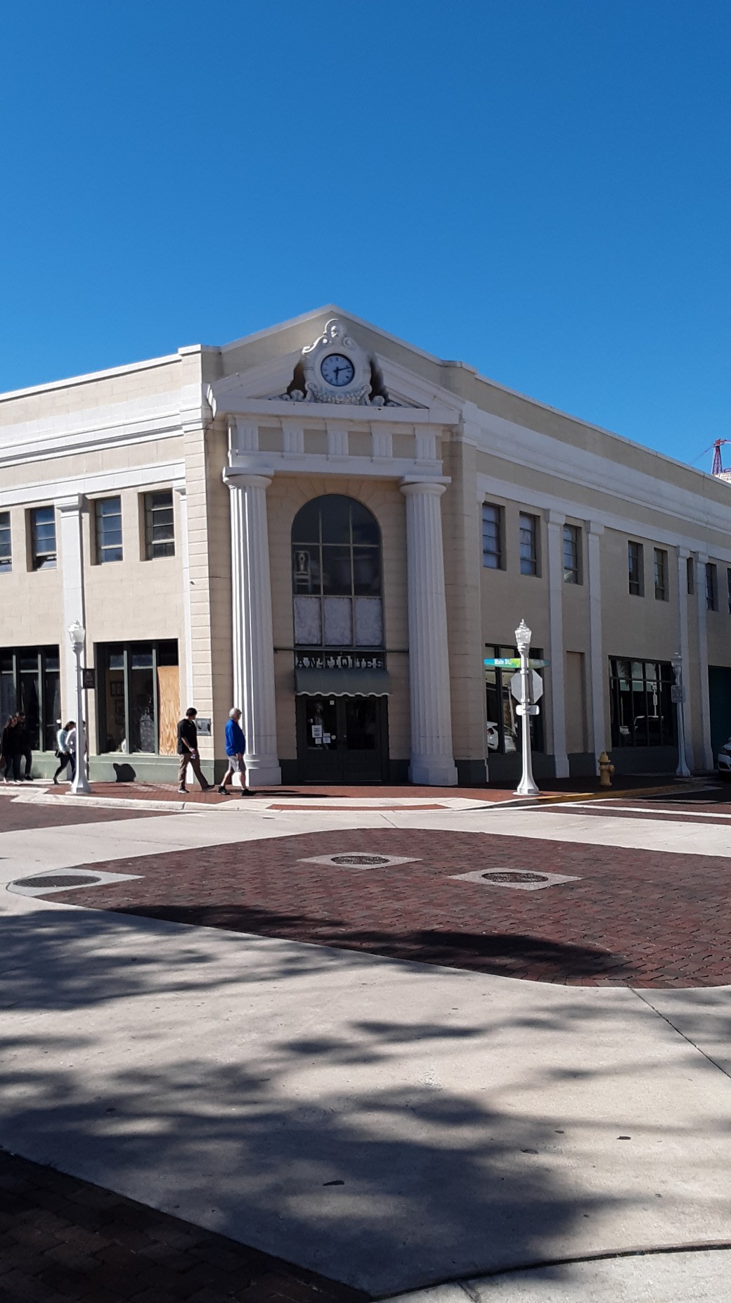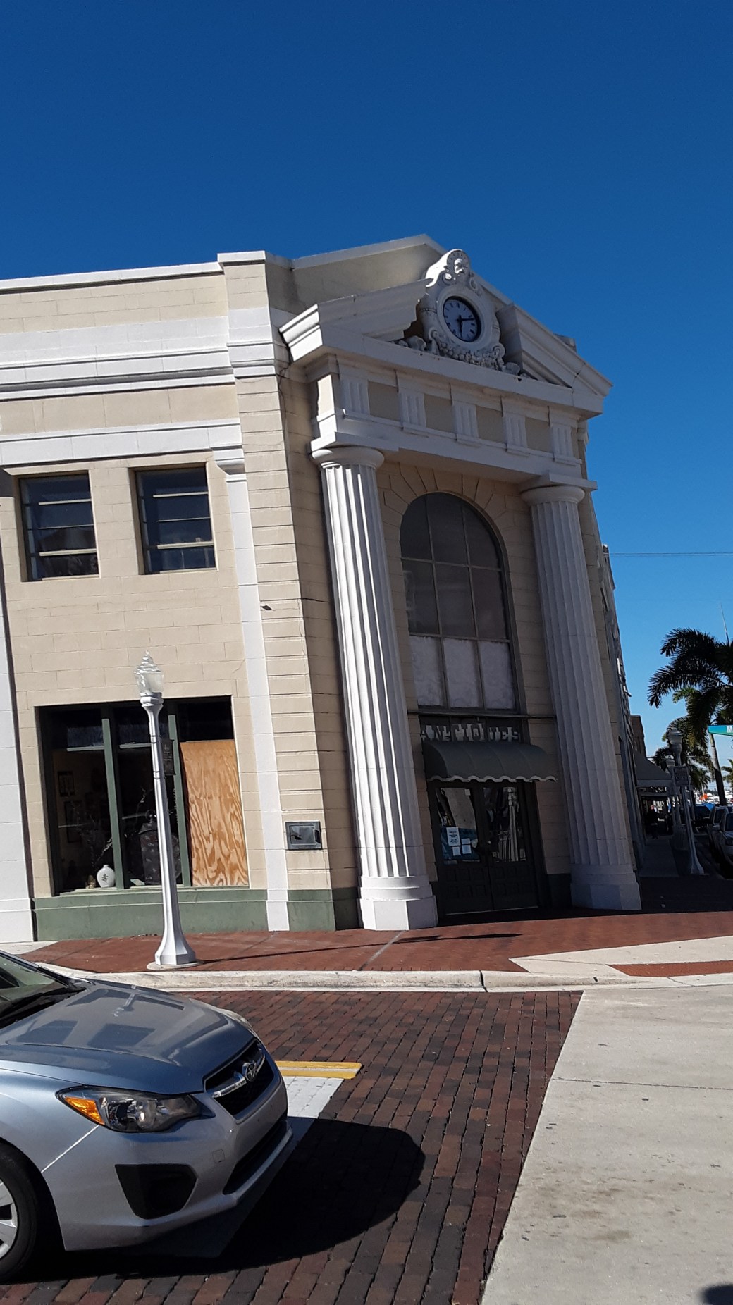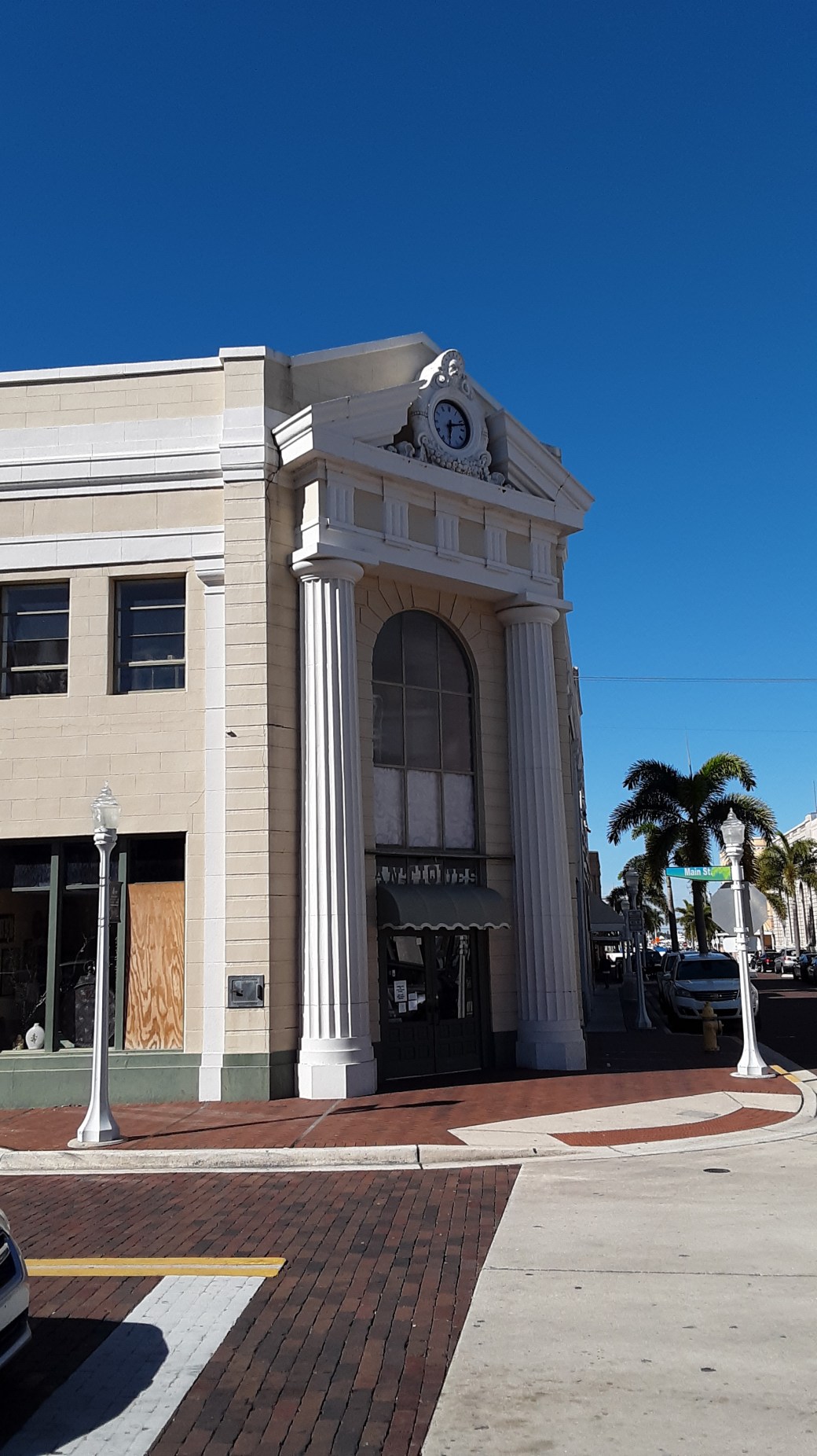 Beginning in 1927, the Lee County Bank and Trust occupied this building. They made modifications including stuccuoing over the outside walls and adding a pair of Doric Columns at the corner entrance. This gave the building a Neoclassical look.
