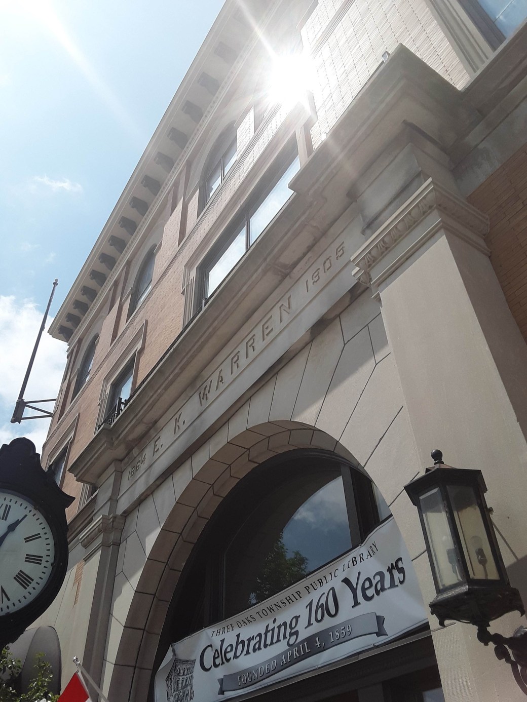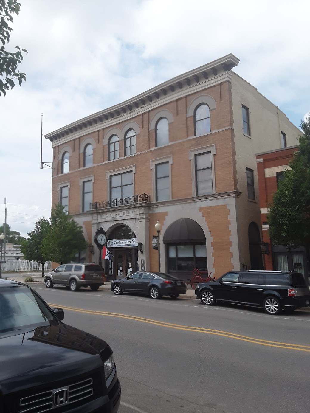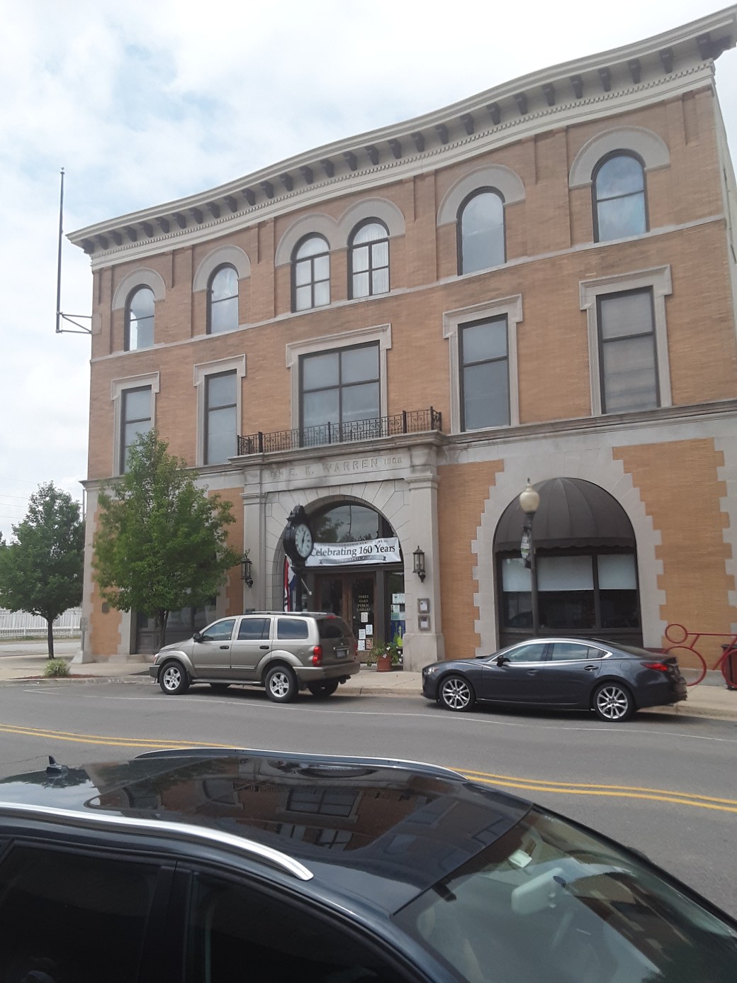 This building is located at 3 North Elm Street in Three Oaks, Michigan. It was owned by Edward K. Warren. In 1858, he opened a dry goods store in Three Oaks. He developed the product feather bone as a replacement for whalebone stays used in women’s dresses. He opened a factory in Three Oaks to manufacture the new stays. In 1905, his company built a new office space at 3 North Elm Street. Warred hired architect George Allan to design the building as the headquarters for Warren Feather Bone Company.