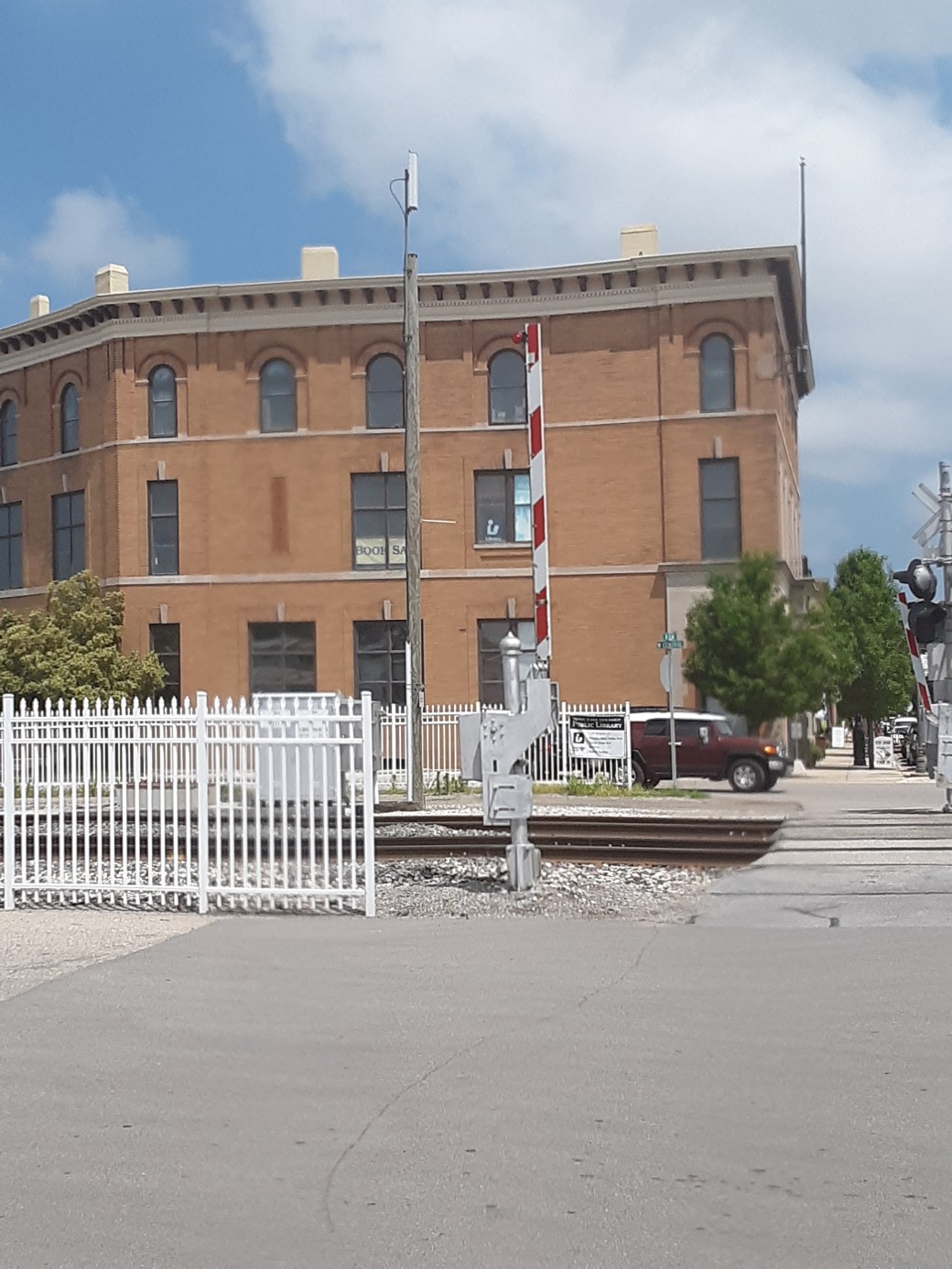 The building is three stories high. It is rectangular in shape The style is Renaissance Revival . Two principal facades are orange brick and have limestone trim. Main facade is symmetrical with a broad , arched opening on the first floor. There are squared head windows on the second floor and round head windows on the third floor.
