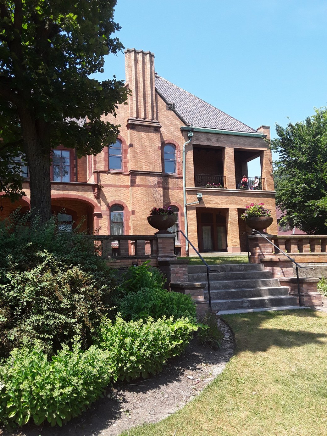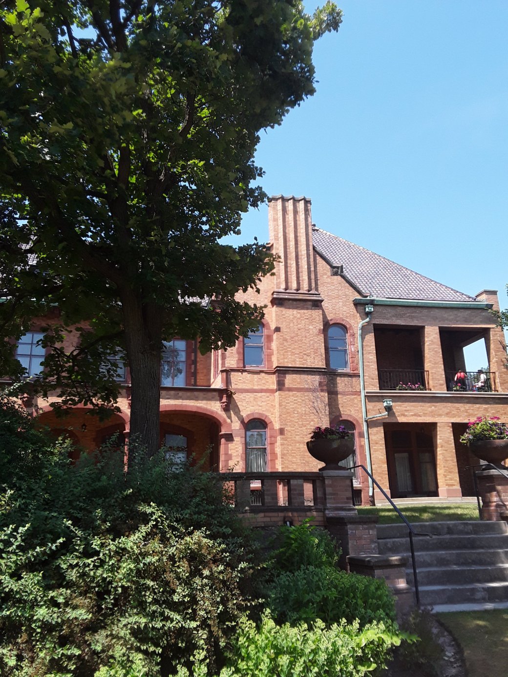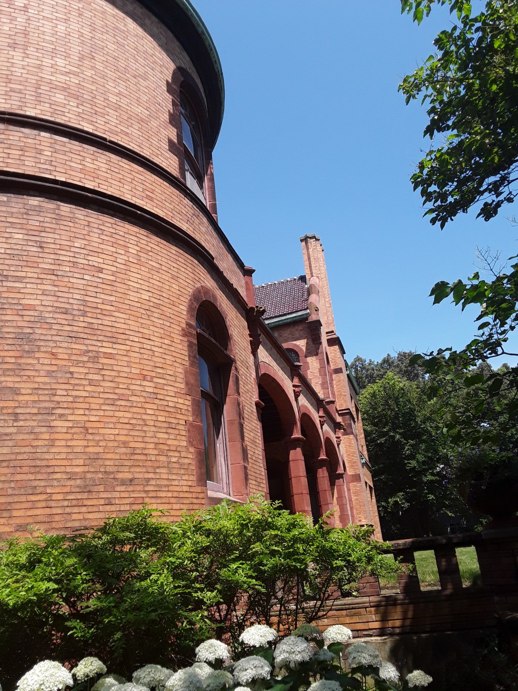 The main house was 3 and one half stories. Its exterior was variegated tan and orange brick with red sandstone trim. There is a ceramic tile terra cotta roof. There are 25 rooms,6 bedrooms, 7 bathrooms, and 13 fireplaces.