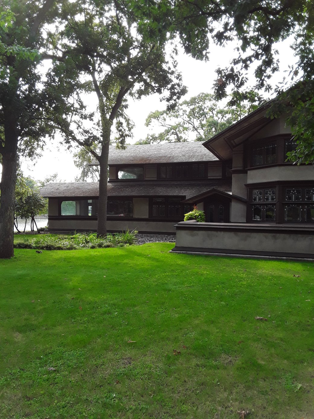 The distinctive features of a Prairie Style home include: long row of windows, stained glass windows, low pitched roof line and prominent chimneys.