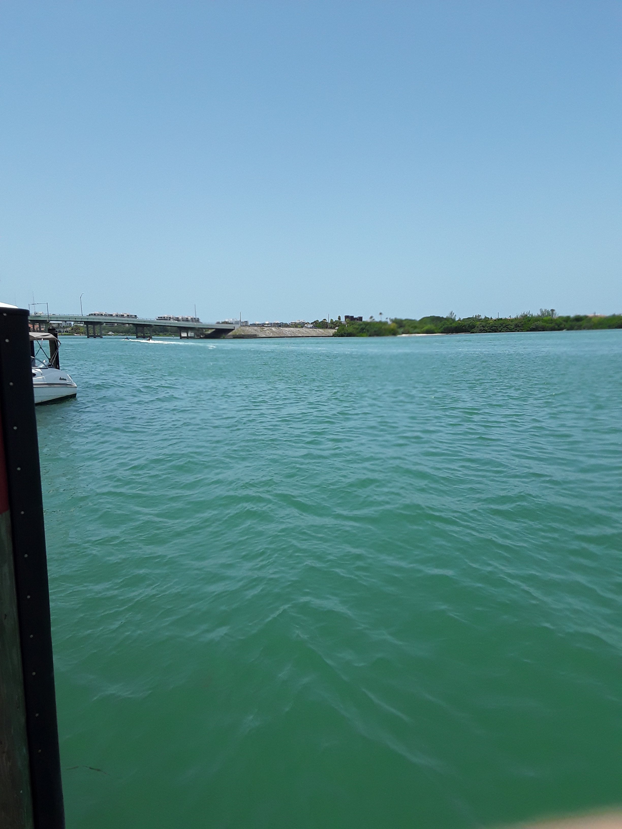Entrance into New Pass Bridge This is a bascule bridge over New Pass on Florida 789 in Sarasota. The total length is 970 feet. The length of the largest span is 117 feet. Bridge width is 55.8 feet. Construction date is 1986. The main span is steel. Deck type is concrete.