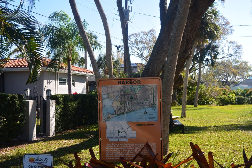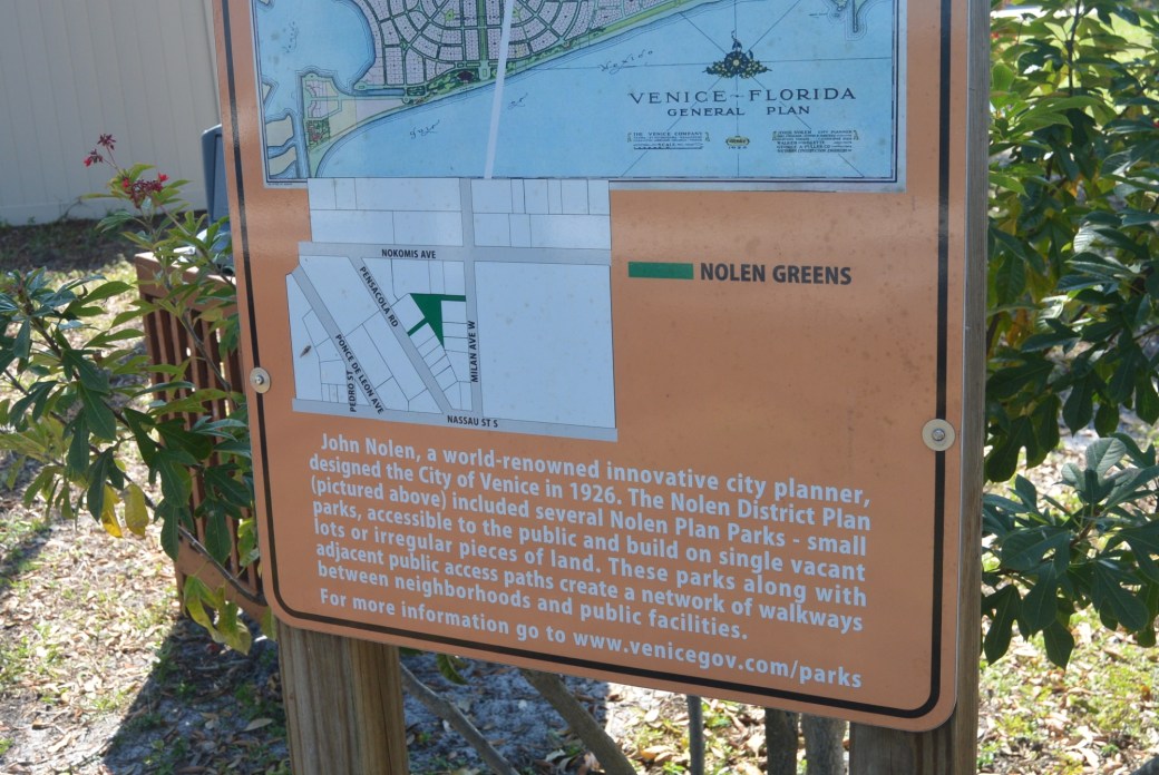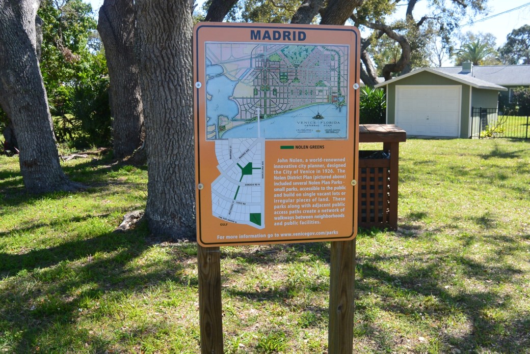 Venice Florida has four pocket parks: Milan Nolen Greens, Granada Nolen Greens, Harbor Nolen Greens and Madrid Nolen Greens. These parks are hidden away on small plots of land between and behind buildings. Each park is distinctive.