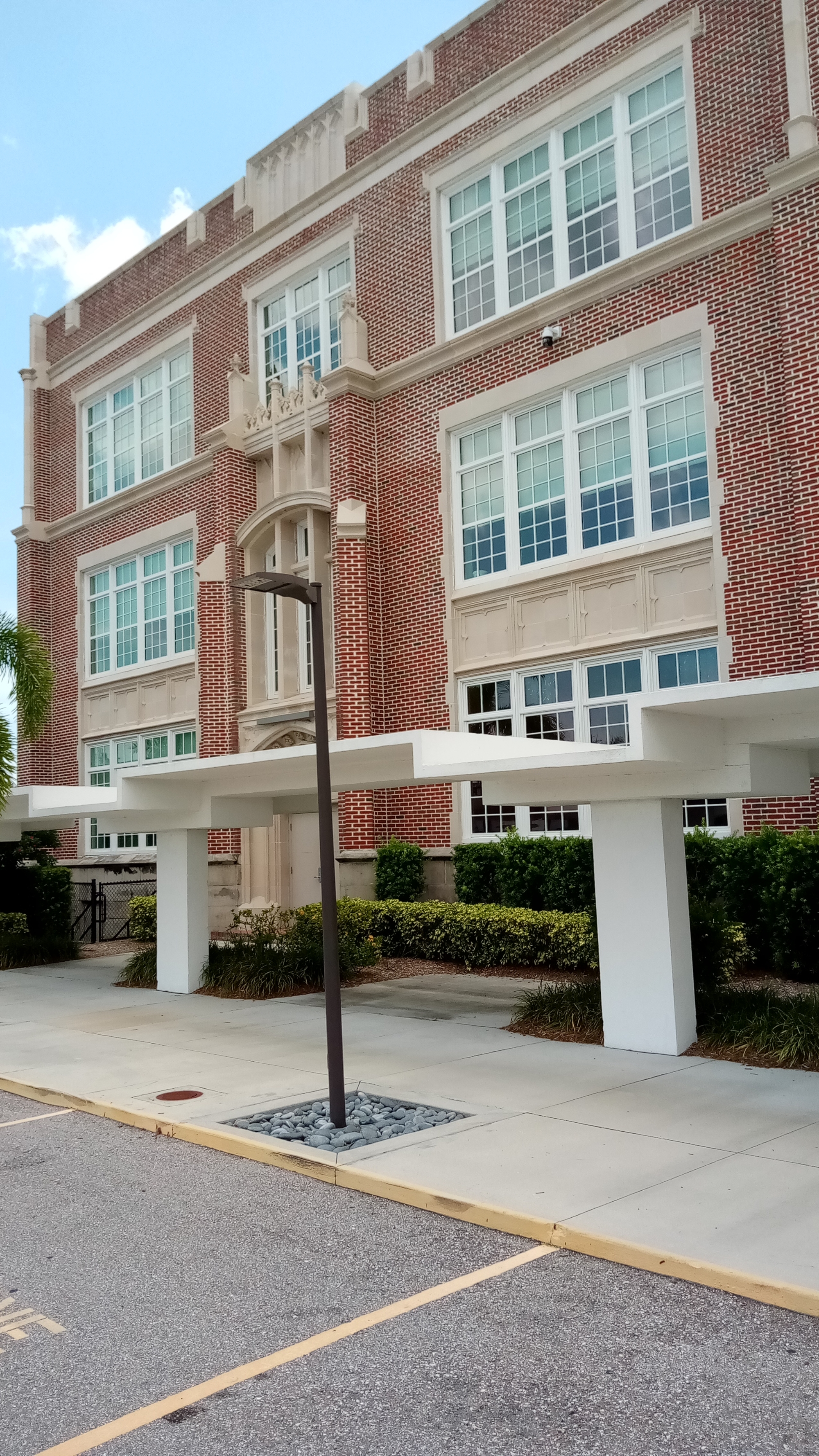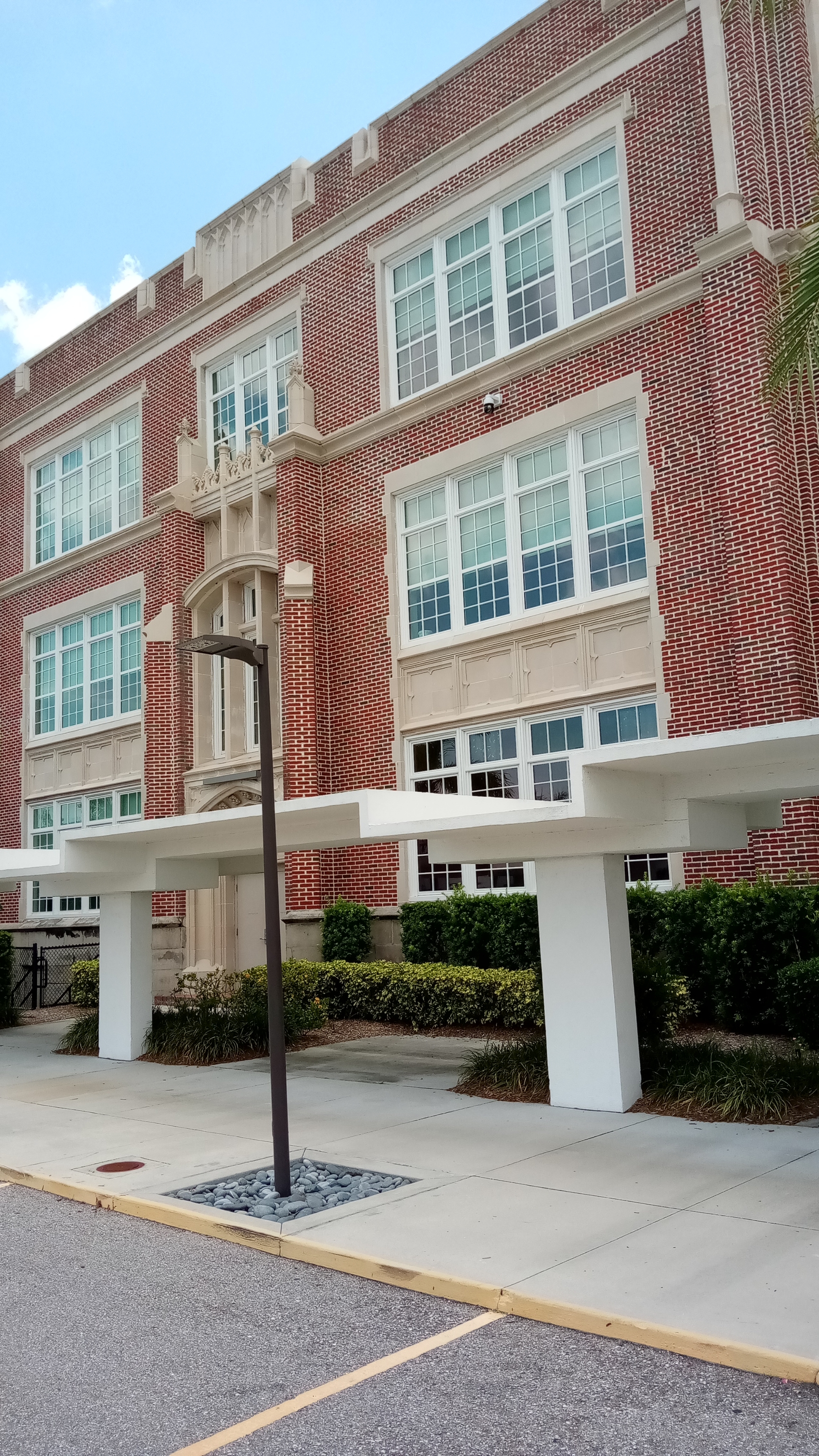 The building is red brick with glazed white Tera cota. Style is a Gothic Revival.It is set on limestone and concrete. Building was 3 stories; with a 4 and one half story entrance.