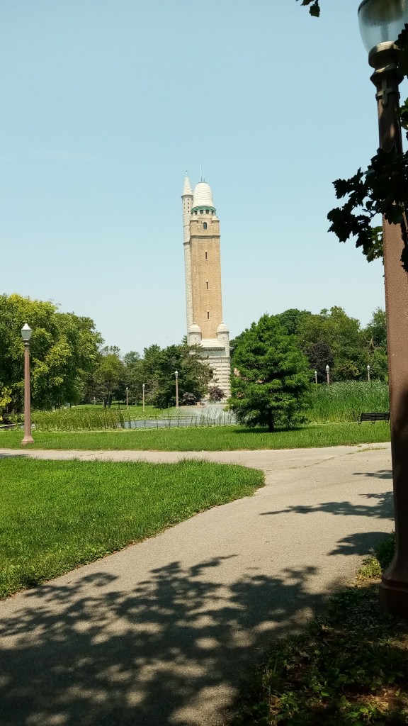 The Compton Hill Water Tower is located at 1898 Grand Boulevard in Saint Louis. It was built in 1898. Construction costs were $48,000. It is 179 feet in height. Its exterior is made of rusticated limestone, brick and terra cotta. The architect was Harvey Ellis. Its walls are adorned with leaves and mythical creatures.