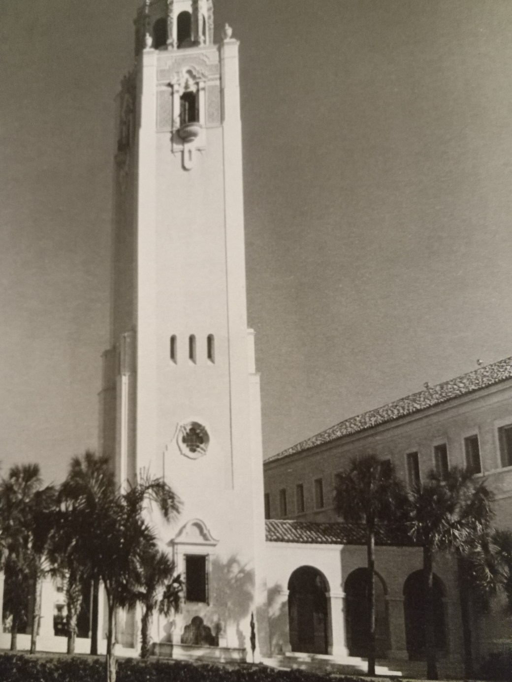 This H shaped building consisted of two 2 story rectangular structures connected to a central tower by an arcade. The two buildings had an exterior of hollow clay tile covered by stucco. The roof was covered by barrel tiles from Spain.