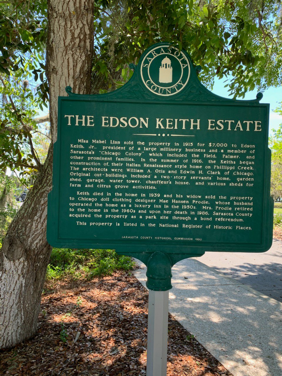Edson Keith purchase a property in Sarasota near Phillippi Creek from Mabel Linn for $7,000 in 1915. Mr. Keith was president of a large millinery business. He was also a member of Sarasota’s Chicago Colony which also included Field, Palmer and other prominent families.
